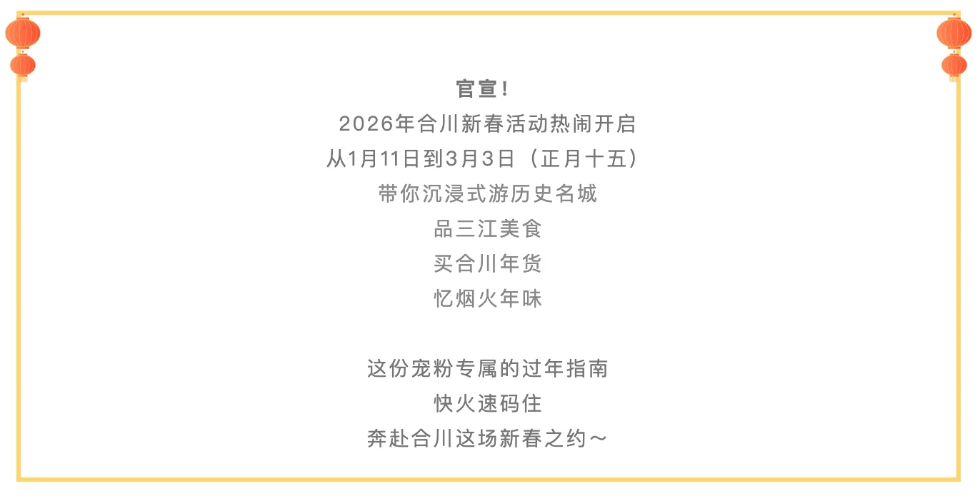 1月11日至3月3日(正月十五),“来合川过年”主题活动重磅启幕,四大版块、N种潮玩直接拉满年味仪式感!无人机天幕秀、迎春灯会、地道刨猪宴… 这份回应全网期待的「年味天花板」预告,提前码住不迷路!