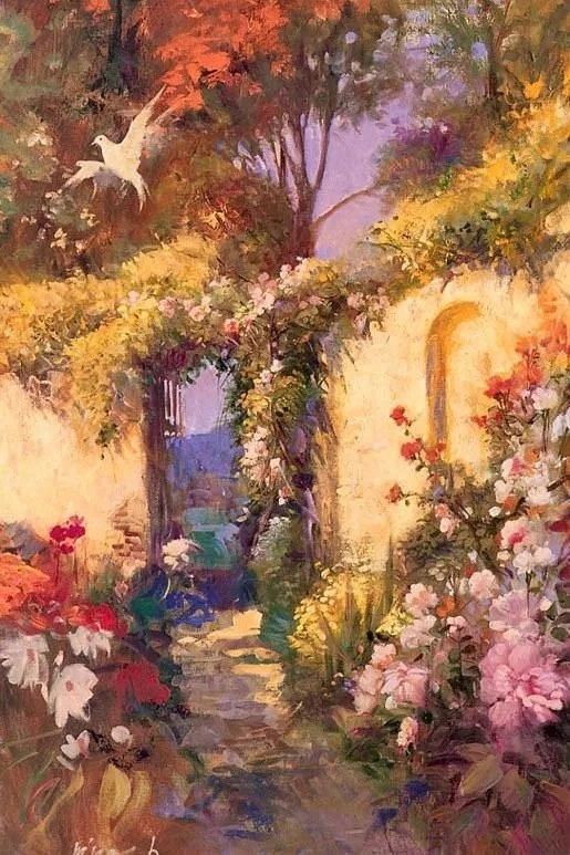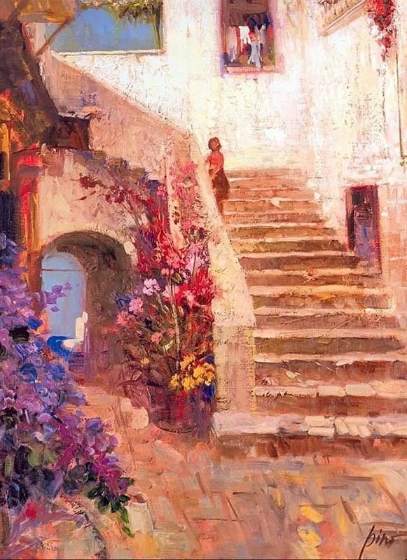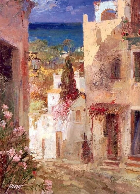 风景在皮诺的画中扮演着多重角色:它是人物情感的外延,是美好记忆的载体,也是一个永恒的理想国度的缩影。无论是海边的微风,还是庭院的光影,都与人物的姿态和神情融为一体,共同诉说着对恬静生活、逝去时光与遥远故土的无限乡愁。因此,他的风景是情感的容器,让画中的人物与画外的观者,都能在其中找到一片灵魂的栖息地。