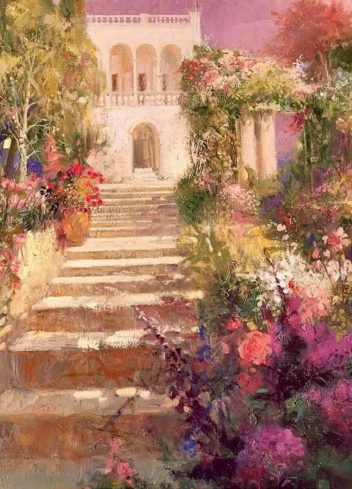 最常见的场景包括:托斯卡纳式温暖的乡村庭院、地中海沿岸明媚的海滩与帆影、静谧的花园一隅,或是笼罩在金色暮光中的古典阳台。这些背景通常以印象派般的笔触柔和地处理,细节被概括,色彩被统一在其经典的淡紫、暖粉、金黄和蔚蓝的色调体系中,营造出一种怀旧、梦幻而又宁静的整体氛围。